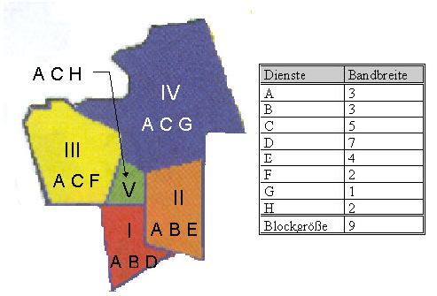 Zum anderen müssen wir den Blöcken entsprechende Kanäle zuordnen, wobei wir im Beispiel davon ausgehen, dass verschiedene Blöcke, die in benachbarten Gebieten übertragen werden, verschiedene Kanäle benötigen. Zwei Lösungen der Planungsaufgabe sind in Abb. 4(a) und (b) dargestellt. Man beachte, dass in Lösung (a) für jedes Gebiet genau die angeforderten Dienste übertragen werden. Wir bezeichnen solche Blockzuweisungen auch als „strikt“. Zur Übertragung aller angegebenen Blöcke werden hier fünf verschiedene Kanäle benötigt. Tatsächlich kann man zeigen, dass im Beispiel jede strikte Blockverteilung mindestens fünf Kanäle benötigt. Lässt man dagegen eine gewisse „Überversorgung“ zu – das bedeutet, zusätzlich zu den gewünschten Diensten dürfen in jedem Gebiet auch weitere Dienste übertragen werden, die eigentlich nicht angefordert wurden – so reichen bereits drei Kanäle zur Versorgung der Gebiete aus, wie es in Lösung (b) dargestellt ist. Bereits in diesem stark vereinfachten Beispiel lassen sich also durch geschickte Verteilung der Dienste auf die DAB-Blöcke kostbare Sendefrequenzen einsparen, wenn man bereit ist, Überversorgungen in Kauf zu nehmen. Diese Beobachtung hat sich auch in umfangreicheren Modellrechnungen bestätigt. Natürlich wird in der Praxis auch der Fall eintreten, dass die Ausstrahlung eines Dienstes in einem bestimmten Gebiet nicht gewünscht wird – etwa aus politischen oder wirtschaftlichen Gründen. Solche zusätzlichen Randbedingungen lassen sich ebenfalls berücksichtigen, verkomplizieren die Planungsaufgabe aber erheblich.