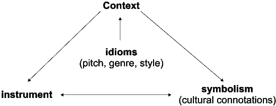 In Within you without you the logistics of the instrumentation are inversely proportional to those of the previous song, in that the context is characterized by an explicit Indian idiom wherein the function of the string orchestra resembles that of the sitar in Norwegian wood, as melodic and timbral reinforcement of the texture. In both cases the textural role of the ‘alien’ instrument is absorbed by the logistics imposed by the dominant cultural context – this is most evident in the choice of idiom and its deriving harmonic and melodic structures – and for this reason the weight given to the instrument is too minimal to establish an intercultural discourse with the other instruments. Although Within you without you presents by far a more interesting musical case than Norwegian wood, in neither song an intercultural dialogue is taking place, as the discourse is defined by one chosen idiom. However, we may agree that Within you without you is more likely to denote a hybrid context, bearing in mind that ‘hybrid’ is not necessarily ‘intercultural’. Also, the two examples show four distinctions: i) how the context is established by the degree of the musical idiom;19