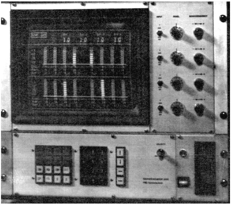 Inspiriert von diesem Versuch und mit Hilfe der Kollegen der Südwestfunk-Technik habe ich auch auf diesem Gebiet mit Bastelarbeiten begonnen. 1955 entstand mein erster Ringmodulator. Ermuntert auch durch ein klanglich schwaches Ergebnis setzte ich meine Versuche fort, bis Peter Lawo und seine Entwicklung von zwei Klangumformern meine Bastelarbeiten in die Herstellung von Profigeräten umwandelte. Die beiden genannten Klangumformer waren für die Uraufführung von Stockhausens „Mantra“ vom Südwestfunk in Auftrag gegeben worden, ein Jahr später wurde mein selbst entworfener Klangumformer für die Uraufführung von Halffters Planto (por las Victimas de la Violencia) in Donaueschingen bedingt funktionsfähig. Abbildung 18 zeigt das Gerät, dessen Konfiguration der einzelnen analogen Baugruppen natürlich noch keine Programmiermöglichkeit besaß, sondern durch Umstecken von Kabeln realisiert werden mußte.