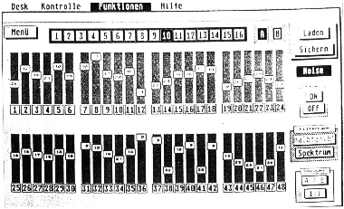Auch bei dieser digitalen Filterbank stand für mich die Bedienfreundlichkeit und sichtbare Anzeige der aktuellen Zustände der einzelnen Filter im Vordergrund (Abb. 23). Ohne große Computerkenntnisse kann ein Komponist dieses rein digitale Gerät wie ein Instrument bedienen, er sieht immer das Ergebnis seiner manuellen Bewegungen und kann diese mit dem gleichzeitigen Hörereignis synchronisieren, ähnlich einem Pianisten, der die Tasten seines Klaviers vor sich hat und jede manuelle Bewegung, in diesem Fall den Tastendruck, gleichzeitig hört. Was ich an diesem Beispiel zeigen möchte, ist die Unmittelbarkeit verschiedner Prozesse, also z. B. kein langwieriges Programmieren bevor das akustische Ergebnis gehört wird. Dies gilt vor allem für Klangmodifikationen während der Probenarbeit. Lassen Sie mich Ihnen zum Schluß noch ein paar Partiturseiten vorführen, Kompositionen, in denen die Elektronische Klangumformung als ein wichtiges Instrument integriert ist. Ich spreche absichtlich von einem Instrument und nicht von technischen Geräten, denn als solche werden sie vom Komponisten eingesetzt. Cristóbal Halffter hat seine Variaciones für 11 Instrumentalisten, einem Tonband und Live-Elektronik komponiert. Er schreibt die Funktionen der Klangumwandlung unter die Instrumentalpartitur (Abb. 25).
