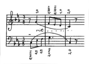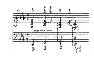 Notenbeispiele 1-5: Unter bzw. über den Noten angegeben sind jeweils die Zeitabstände in Sekunden bis zum nächsten Anschlag bzw. beim letzten Ton und vor Pausen die Tondauer. Die in Notenwerten dargestellten rhythmisch-agogischen "Auflösun-gen" sind allerdings nicht objektiv gültig, sondern nur relativ naheliegende Deutungen; einige Versionen lassen andere, ebenso richtige Deutungen zu und werden auch von verschiedenen Hörern verschieden aufgefaßt. Durch verschiedene Faktoren (z.B. gleichzeitig gezeigte Dirigierbewegungen, Mitlesen einer Lösungsmöglichkeit in Noten) kann der Hörer auf eine bestimmte Deutungsmöglichkeit hingeführt werden, so daß sich die musikalische Zeit mit größerer Bestimmtheit ausprägt. |