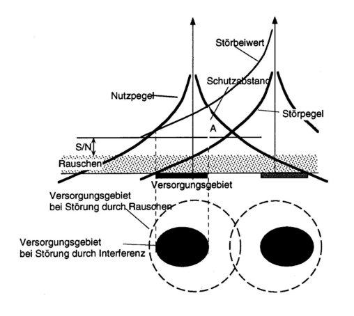Mit der Zeit ergaben sich neue Anforderungen nach größeren Versorgungsgebieten und neuen Programmen. Der Bau eines neuen Senders in der Nähe, der auf der gleichen Frequenz sendet, stört den ersten durch Interferenz so, daß sich das Gesamtversorgungsgebiet erheblich verkleinert (Abbildung 2). Es ist daher notwendig, dem zweiten Sender eine neue Frequenz zuzuweisen.