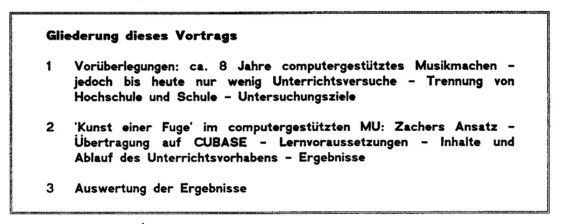 Diese Tafel und die folgenden wurden während des Vortrags aus dem Schreibprogramm Script (für Atari ST) über ein Overhead-Display auf eine Leinwand projiziert. Mit Hilfe des Switcher-Programms von Steinberg war es möglich, zusätzlich das Sequenzerprogramms Cubase in den Arbeitsspeicher des Computers zu laden, so daß durch einfaches Umschalten beide Programme