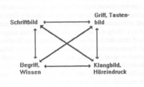 Man stelle sich diese "Schnittstellen" untereinander verbunden vor. Der "Kontakt" zur Musik kann in jeder der vier Gestalten erfolgen, und im Idealfall löst der Impuls an einer "Schnittstelle" eine Assoziation bei den drei anderen Punkten aus: beispielsweise stellt sich beim Hören eines Dominantquintsextakkords die Assoziation der konventionellen Tonika-Auflösung mit ihren Stimmführungsregeln ein (Begriff, Wissen), ein Notenbild steht vor dem geistigen Auge (Schriftbild), und die haptische Assoziation des am eigenen Instrument gegriffenen Akkordes stellt sich ein (Griff). Ein anderes Beispiel für dieses Modell, das man als Lehrer oft beobachten kann, ist der Geiger, der eine Melodie hört und beim Versuch, ihre Töne zu bestimmen, auf einem "imaginären" Griffbrett die Finger auf die entsprechenden Positionen setzt. Wie man sieht, spielt in diesem didaktischen Modell des Gehörbildungsunterrichts die Einbeziehung von Instrumentalspiel und Musiktheorie eine wichtige Rolle. |