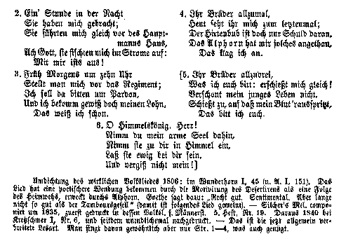 Auch in dieser Komposition fällt zunächst das gehäufte Auftreten von Militärmusikidiomen ins Ohr. Davon sind die Takte 5–6, 13-20, 23-28, 31–42 und 57–61 bestimmt, also zusammen 33 von von 61 Takten. Zuvorderst handelt es sich zum einen um Marschrhythmen, vor allem die des Trauermarsches, gekennzeichnet durch die Punktierung auf der zweiten Zählzeit. Zum anderen fallen die vielen Trommelwirbel auf, wozu Mahler ausdrücklich anmerkt, daß »in allen tiefen Trillern mit Hilfe des Pedals der Klang gedämpfter Trommeln nachzuahmen« ist. Militärsignale tauchen dagegen nicht auf, da das von Dreiklangsbrechungen bestimmte Idiom in diesem Lied dem Alphorn zugewiesen ist. Identisch mit dem Auftreten der Militäridiome ist die Mollsphäre. Mit Ausnahme der Takte 39–42 stehen alle Passagen mit militärischem Charakter in Moll, alle anderen in Dur. Diese Zweiteilung ist textlich bedingt; die Dur-Sphäre handelt von der Erinnerung an das Alphorn, das das Heimweh des Soldaten wachrief und sein Desertieren auslöste, in der Mollsphäre berichtet er von seinem Schicksal nach dem Desertieren. Die Ausnahme der Takte 39–42, wo trotz der Marsch- und Trommelrhythmen B-Dur vorherrscht, begründet sich ebenfalls durch den Text, in dem der Erzähler seine Brüder anspricht. Die folgende Dur-Sphäre erfährt ebenso textlich bedingte chromatische Trübungen: »heut’ seht ihr mich zum letzen mal«. Hilmar-Voit macht ein Zitat von Schumanns Zwei Grenadiere in Mahlers Lied aus: Mahlers »ins Vaterland muß ich hinüber schwimmen« (Takt 11f.) sei identisch mit Schumanns »Dann reitet mein Kaiser wohl über mein Grab« (Takt 79f.), es handelt sich um die Stelle, wo Schumann die Marseillaise zitiert. Die Übereinstimmung fällt bei Hilmar-Voit aber nur deshalb so ins Auge, weil in ihrem Notenbeispiel bei Schumann die Vorzeichen (B-Dur) fehlen. Respektiert man diese, so ergibt sich bei Mahler eine andere Intervallfolge und auch eine andere Lage des Zitats, so daß die Übereinstimmung weit weniger frappierend ist. Auch wenn es ein Zitat sein
