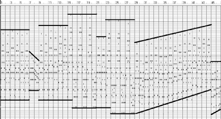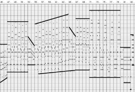umfassen meistens eine Breite zwischen vier- und fünfeinhalb Oktaven, manchmal jedoch Bandbreiten von nur zwei (T. 7–8, 53–54) oder drei (T. 45–46, 81–82) Oktaven. Die parametrischen Frakturen um die Taktstriche 44/45, 46/47, 80/81 und 82/83 sind sehr bedeutend, da sie sowohl die Höhe als auch die Breite der Register betreffen. Weniger wichtig sind die T. 7–8 und 53–54, in denen plötzlich diese Breite für kurze Zeit halbiert, und dann wieder verdoppelt wird. Die anderen Wechsel in der Breite der Register können als weniger bedeutend bewertet werden. Die aufsteigenden Bandbreiten der Register in den T. 29–44 und 55–64, und der einzigartige Abstieg des Diskants in den T. 65–66 bilden charakteristische Merkmale dieser Etüde. Schließlich kann noch vermerkt werden, dass der letzte Takt sich in keiner Weise mit dem Rest des Stückes verbinden lässt. Seine erste Hälfte weist ein sehr tiefes Register auf (es beinhaltet die tiefste Note des ganzen Stückes (C1)), |