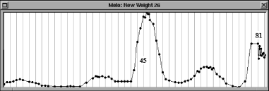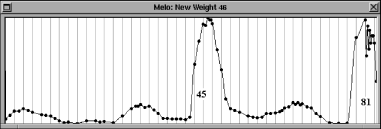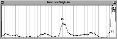 Stellen sind in den traditionellen Analysen mehrmals aufgefallen. Die erste stimmt mit den vierteltaktigen Bindebögen überein, welche die Rückkehr der Tonika und des Anfangsmaterials vorbereiten. Die zweite betrifft den unvorbereiteten Wechsel nach Des-Dur, und die dritte den stark kontrastierenden Schlusstakt mit seinen beidhändigen Pausen. Das Gewicht [dia, 0.125, 2] beinhaltet diese Eigenschaften in reinster Form (Abbildung 11.14). Das Zickzackmuster, das den restlichen Verlauf der Kurve ausmacht, ist vergleichsweise zu schwach geprägt, um bei einer Interpretation ausschlaggebend zu sein. Nur die zahlreichen Zapfen (nach unten gerichtete Spitzen) können die akustische Umsetzung beeinflussen. Die beiden einzeln stehenden Zapfen, in T. 7 und 53, stimmen mit der dort sich befindenden absteigenden Tonleiter mit metrischer Verschiebung überein. Die beiden Dreiergruppen im ersten Drittel des Stückes, sowie die Fünfergruppe am Ende, sind mit dem charakteristischen Akzentmuster in Verbindung zu bringen. Die paukenimitierende Figuration in T. 81–82 wird schließlich auch mit größeren Zapfen versehen. Aus all diesen Gründen erweist sich das besprochene Gewicht als stark interpretationstauglich.