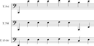 ist kurz vor der Rückkehr einer genauen parametrischen Wiederholung von T. 5, und an T. 92 schließt sich direkt die letzte Präsentation des Hauptthemas an – verleiht ihnen eine zusätzliche strukturelle Bedeutung. In den beiden ersten Takten der Etüde wird das Hauptthema des Stücks vorgestellt. Vernachlässigt man jedoch den Rhythmus, so zeigt sich dieser melodische ›Grundgedanke‹ als sehr wenig charakteristisch. Er besteht aus einer sechsmaligen Wiederholung des E, unterbrochen von einer Halbtonbewegung zum F hin und zurück, sowie einem ähnlichen Terzsprung E–C–E (Abbildung 4.21).