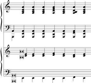 Die Abschnitte der linken Hand, die bis zu diesem Punkt noch nicht unter dem melodischen Aspekt analysiert wurden, sind sehr schwer einzuordnen. In ihnen gibt es keine kompletten Melodien im herkömmlichen Sinne des Wortes, sondern lediglich kurze melodische Motive, die unregelmäßig verwendet werden. Eine weitere Schwierigkeit resultiert aus der Tatsache, dass die ständigen Registerwechsel sehr weite Intervallsprünge mit sich bringen, die den melodischen Verlauf auseinanderreißen. Bei der Betrachtung von Abbildung 4.26 wird jedoch klar, dass dieser Verlauf selbst ohne Registerwechsel nicht eindeutig zu bestimmen wäre. Die Chromatik und die variable Anzahl der Stimmen tragen zu einer melodischen Konfusion bei. Deshalb sei auf eine detaillierte Analyse all dieser Einzelfälle verzichtet, da diese im Hinblick auf die anstehende Interpretation unwichtig sind. 4.4. RhythmusDie Analyse des Rhythmus in der rechten Hand kann schnell durchgeführt werden. Mit Ausnahme der vier ersten und vier letzten Takte sowie der beidhändigen Pausen spielt diese Hand durchweg Sechzehntelsextolen. Die einzige Ausnahme befindet |