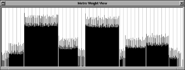Noten der rechten Hand (ohne Rollentausch in T. 41–44)Eine metrische Analyse der Noten der rechten Hand zeigt vier sehr lange und kompakte Raster von Sechzehntelsextolen in den T. 13–30, 45–62 (jeweils mit einer Länge von 420 Elementen), 77–88 (276 Elemente) und 66–76 (252 Elemente) (Abbildung 7.5 oben). Zusätzlich zu diesen vier können noch drei andere, weniger bedeutende blockähnliche Gestalten (T. 31–41, 5–12 und 91–93) in allen Gewichten, die einen mp von 2 oder mehr haben, deutlich erkannt werden (Abbildung 7.5 unten).