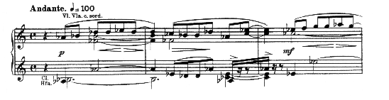 Dort wird der eingezäunte Garten der Försterei etabliert (erstmalig 12 Takte vor Ziffer 1 in der Verwandlungsmusik). In dem Moment, in dem die Überblenden in den Wald beginnen (14 Takte nach Ziffer 11), erklingt der zweite Teil dieses Themas (erstmalig 10 Takte vor Ziffer 1), hier allerdings in vollem Ges-Dur, während er zu Beginn des Bildes zum Garten der Försterei in as-Moll erklang. Auch wenn wiederum nicht behauptet werden kann, dass ein solcher Tonart-Wechsel die Aufhebung der Realität des Gefängnisses, das die Försterei vorher darstellte, bedeutet, so ist doch die durch das Ges-Dur verwandelte Musik der Försterei der Grund, warum die Überblenden in innere Vorstellungswelten stimmig wirken und nicht gegen die Musik erscheinen. Auch die 5. Kameraeinstellung, die die Visions-Szene wieder für kurze Zeit in die Försterei-Realität zurückkehren lässt, geschieht zu einem musikalischen Verlauf, der die Rückkehr in die Realität anzeigt und zwar durch den harmonischen Verlauf: Der reale Rahmen der Intermezzo-Szene erklingt in b-Moll (3 Takte nach Ziffer 11), auch die direkt vorhergehenden Schmerzensrufe des Füchsleins, als es angebunden wurde, erklingen in dieser Tonart. Die Wald-Visionen dann, beginnend in Ges-Dur, führen in die entfernte Kreuztonart D-Dur. Vier Takte vor Ziffer 13 beginnt die 4 Takte dauernde Rückkehr in die Realität, deren musikalischer Verlauf über abwärts verlaufende Dominatklänge bis zur Dominante wiederum von b-Moll (1 Takt vor Ziffer 13) führt. Die 6. Kameraeinstellung dann, der Schnitt auf den realen Förster, ließe sich harmonisch und thematisch begründen: in b-Moll, der Tonart der realen Ebene der Szene, erklingt der zweite Teil des Försterei-Themas (dessen Verwandlung in Ges-Dur 14 Takte nach Ziffer 11 die Visionen auslöste). Der Schnitt auf die Augen des Füchsleins in der 7. Kameraeinstellung wiederum ist deutlich harmonisch begründet, statt dem erwarteten b-Moll erklingt B-Dur (6 Takte nach Ziffer 13) und zwar als flimmernde, stark an das Getümmel im Wald erinnernde Figur in den Violinen, entwickelt aus dem Motiv der ›Au‹-Rufe des Füchsleins. Durch die 6. Einstellung, die nochmal den realen Förster zeigt, ist deutlich gemacht, dass das Folgende die sich am Blick des Füchslein entzündende Vorstellungswelt des Försters ist. Die Verwandlung der Füchslein-Augen in die einer jungen Frau geschieht zu Takt 8 nach Ziffer 13. Es erklingt eine »echt Janaceksche Melodie von großer Weiträumigkeit und Schlichtheit«,153