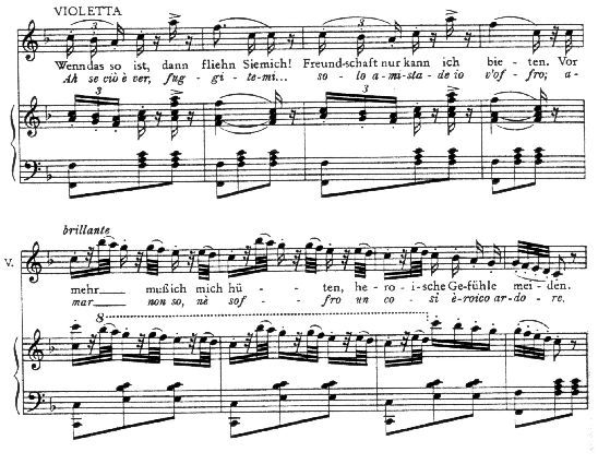 Diese Wirkung belegt Felsenstein mit der zerrissenen Gesangslinie der Antwort Violettas. ![]() Violetta ist nicht in der Lage, eine Kantilene durchzuhalten, die den heroischen Worten gemäßer wäre. Der souveräne Text (»Wenn es so ist. . . «) würde exakt die Linie, die Verdi komponiert hat, verlangen, jedoch als gebundene Kantilene. Das staccato und die Zweiunddreißigstel-Pausen, die die Kantilene unterbrechen, verraten jedoch ihren wahren inneren Zustand. Dass Alfred in diesen staccato-Gesang immer wieder seine schwelgende Liebesmelodie singt, bis beide Stimmen sich in der Kadenz vereinen und sie in Terzabstand beenden, lässt Felsenstein diesen |