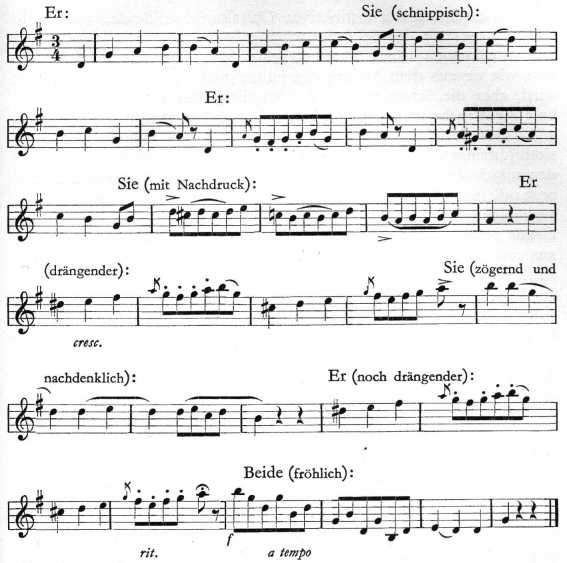 Hier ist die Stelle, wo die Musikalität des Laien sich von der des Musikers meist grundsätzlich trennt. Aber während solche außermusikalischen Beziehungen sonst Hilfsvorstellungen sind, entwickeln sie sich hier zu produktiven Kräften. Auf die Antwort folgt eine neue Frage. Sie wird diesmal mit etwas andern Worten gestellt: wir stehen an der Wurzel der Variation. Er und Sie stehen einander nun gegenüber. Spieltrieb und Freude an dem kleinen Programm bauen den Dialog zu einer selbständigen kleinen Szene aus. Es wäre vielleicht nicht nötig, so ausführlich darüber zu sprechen, wenn nicht der Spieltrieb