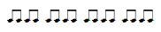 Als nächste Aufgabenstellung soll eine Kette entstehen, bei der im Kreis herum nahtlos alle Mitwirkenden einen Rhythmus (einen Vierertakt) füllen. Wichtig ist dabei, den Teilnehmenden gegenüber deutlich zu machen, dass es nicht um Virtuosität geht, sondern um Stabilität im Grundschlag. In einer Gruppe von musikalischen Laien (erfahrungsgemäß aber auch in Gruppen mit musikalischem Hintergrund) sind immer Menschen, denen die beschriebene Aufgabenstellung schwer fällt. Ein häufig anzutreffendes Problem ist, dass die Phrasenlänge nicht eingehalten wird. Ist dies der Fall, kann eine Aufgabe eingeschoben werden, bei der der Rhythmus durch ein Sprachmuster gestützt und verdeutlicht wird. Dazu kann der Text der Begrüßung herangezogen werden: »Schwere Steine, runde Steine«. Im Kreis herum spielt und spricht jede/r nun diesen Vers rhythmisch, die Übergänge erfolgen möglichst unter Beibehaltung des Grundschlags. In der nächsten oder übernächsten Runde können die Teilnehmenden dann versuchen, mit den Steinen Rhythmen auszuführen, die vom gesprochen Rhythmus abweichen. Die Option, bei dem vorigen, schlichten Muster zu bleiben besteht aber weiter: Maßgabe ist nach wie vor |