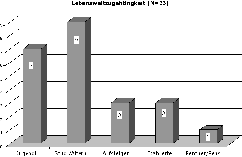 LebensweltDas Profil der Stichprobe kristallisiert sich noch deutlicher heraus, wenn man die von Krotz (1990) ermittelten Lebensweltkategorien zugrunde legt:6