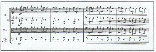 Die Streicher setzten mit drei rastlos getupften Achtelakzenten ein, auf denen sich eine ebenso rastlose Melodie erhebt. Rossini entspricht hier ganz seiner Gewohnheit, wenn er das erste Thema von den Streichern vortragen läßt. Auffällig ist die prägnante Symmetrie des Themas, dessen Hauptmotiv drei Triolen sind, die kurzweilig auf einer Halben oder Achtel verweilen und dann weiterfließen. Rossini hält diese rhythmische Grundkonzeption während des gesamten Themas bei und führt sie lediglich auf verschiedenen Stufen aus, so daß die Melodie ununterbrochen weiterfließt, während Baß und Violoncello unentwegt den Dreiertakt akzentuieren. Ab dem Takt 109 gerät das erste Thema bereits in jene »Crescendo-Spirale«, das Markenzeichen der Ouvertüren Rossinis (vgl. Abbildung 11.13).71