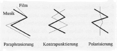 Die Paraphrasierung arbeitet mit ähnlichen Profilen, bei der Kontrapunktierung verlaufen die Profile gegensätzlich; bei der Polarisierung ist die Komponente Film indifferent und tendiert zur neutralen Mitte, während die Musik durch ihren |