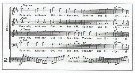 Die Bläser weisen zunächst zaghaft auf den Hymnus hin (Takt 199 bis 200) bis der Chor im Unisono den Sieg der Brüder besingt (Takt 213 bis 260), nun, da er seine Errungenschaft ist. Das Unisono deutet auf die Ideale Gleichheit und Brüderlichkeit, denn nach einem geeinten Sieg wird der Hymnus, Schillers erste Strophe, nun mit neuem Recht und neuer Feierlichkeit vom Chor triumphierend hinausgeschmettert (vgl. Abbildung 11.24).135