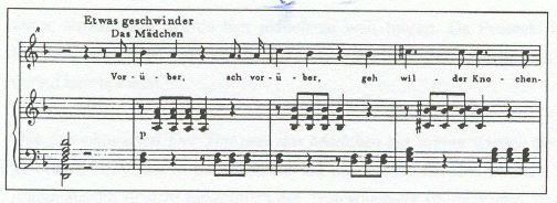 Die Mädchenstrophe ist als dramatisches recitativo accompagnato komponiert. Dabei folgt Schubert der Metrik des Gedichts, indem das Mädchen erregt spricht. In ihrer Strophe herrscht angsterfüllte Atemlosigkeit vor, das Singen ist von Pausen unterbrochen (vgl. Abbildung 13.3).19