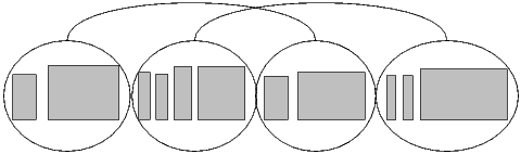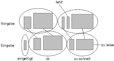 Eine rhythmisch-motivische Interpretation besteht aus Motiven und Zuordnungen von Motiven. Für musikwissenschaftliche und tutorielle Anwendungen ist es wichtig, daß detaillierte Informationen über die Zuordnungen und evtl. Unterschiede der Motive zur Verfügung stehen. Daher ist es sinnvoll, innerhalb der Motive auch die Noten zuzuordnen. Dadurch kann für jede Note angegeben werden, wie sie sich von der zugeordneten Note unterscheidet bzw. ob sie fehlt oder hinzugefügt wurde. Auch das relative Tempo eines Motivs im Vergleich zum zugeordneten Motiv und die relative Position im Vergleich zur erwarteten Position können auf diese Weise berechnet werden. Eine solche Interpretation und die Informationen, die sie enthalten sollte, ist in Abbildung 7.1 skizziert.