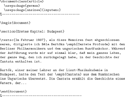 Aus dem strukturierten bzw. bearbeiteten Quelltext erzeugt LATEX nun den in Abbildung 8.6 dargestellten Text. Der Autor muss sich, wie bereits erwähnt, keine Gedanken um die Darstellung bzw. das Layout des Textes machen. Die Kapitelüberschrift wird z. B. automatisch durch einen speziell definierten Abstand, der natürlich von der jeweiligen Schriftgröße abhängt, vom Text abgehoben. Zusätzlich wird eine Überschrift – auch wieder in Abhängigkeit von der gewählten Schriftgröße – entsprechend fett und größer dargestellt.