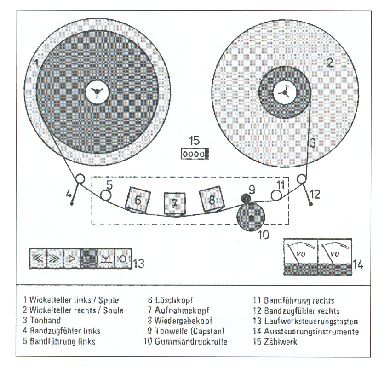 Ein Tonband besteht im Wesentlichen aus zwei verschiedenen Funktionsbereichen. Unterschieden wird hier zwischen dem Antriebsteil und dem elektronischen Übertragungsteil. Vom Prinzip her funktioniert ein Tonband so, dass die Informationen auf einem magnetisierten Band gespeichert werden. Der Antriebsteil sorgt dafür, dass das Band mit genau definierter und vor allem gleichmäßiger Geschwindigkeit23
