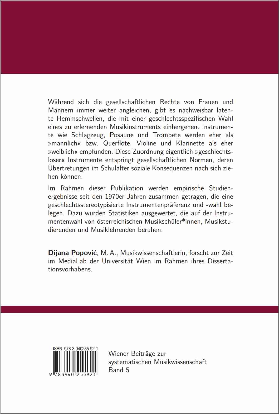 | | | |  | Popović, Dijana»Der Junge spielt Trompete!«Über den Einfluss von Geschlecht und Genderstereotypen auf die Musikinstrumentenwahl epOs-Music, 82 Seiten, zahlreiche Graphiken, farbige Abbildungen und Tabellen, Quellenangaben Bd. 5 in der Reihe "Wiener Beiträge zur systematischen Musikwissenschaft", hrsg. v. Christoph Reuter